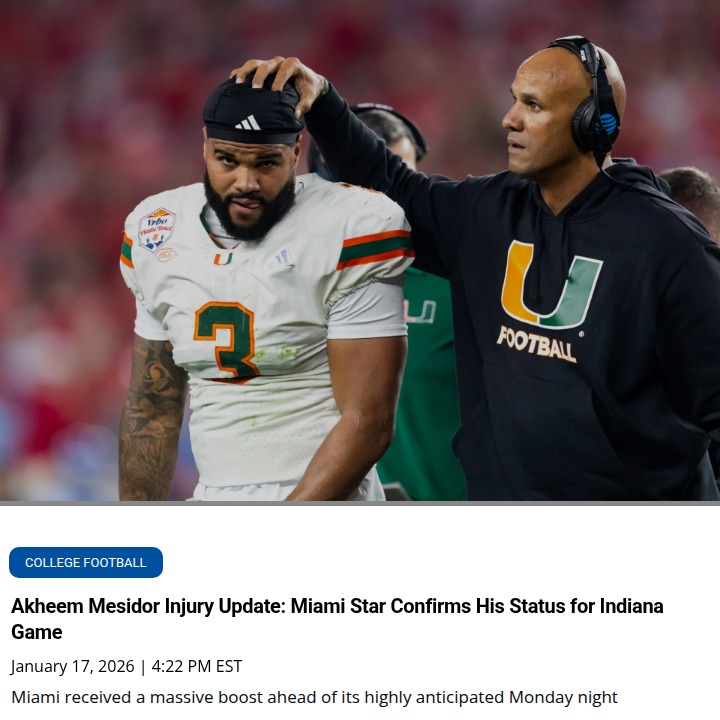 John Camacho+FollowMiami’s Mesidor is back—just in time for IndianaAkheem Mesidor’s return couldn’t come at a better moment for Miami. After weeks of uncertainty, the Hurricanes’ defensive star is officially suiting up at full strength for the huge clash against No. 1 Indiana. With Indiana’s offense putting up jaw-dropping numbers, Miami’s hopes of an upset rest heavily on Mesidor’s ability to disrupt the Hoosiers’ rhythm. Fans can breathe a little easier knowing their leader is back on the field. Can Mesidor’s presence help Miami pull off something special? Let’s hear your thoughts—how big of a difference will he make Monday night? #Sports #Football #MiamiHurricanes00Share