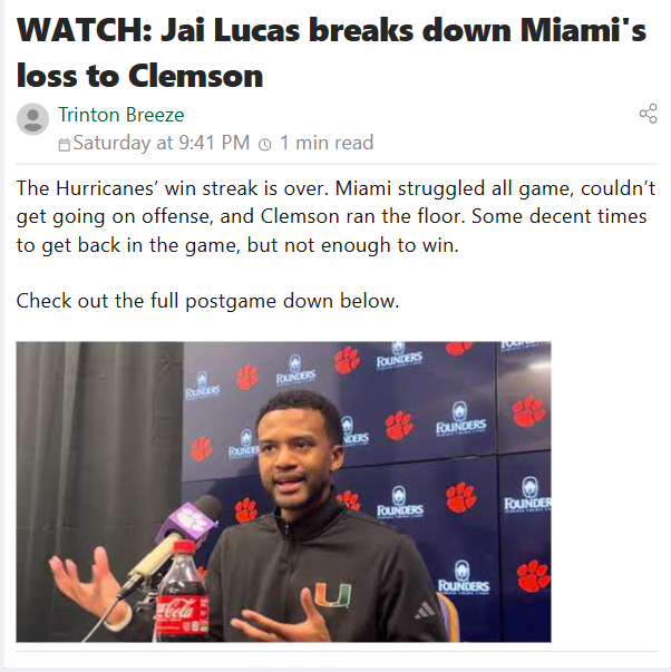 glen25+FollowMiami’s streak snapped: What went wrong?Miami’s winning run came to a sudden halt as Clemson outpaced the Hurricanes on both ends of the court. The offense just couldn’t find its rhythm, and every time it looked like Miami might claw back, Clemson answered right away. It’s a tough loss, especially after such a strong stretch. What do you think Miami needs to change to bounce back? Is it just an off night, or is there a bigger issue to fix before the next game? Let’s talk about what’s next for the Canes. #Sports #Football #MiamiHurricanes00Share