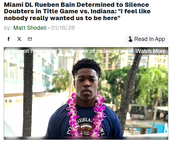 Jeffrey Armstrong+FollowMiami’s underdog story: Bain’s last stand for the cityRueben Bain and the Miami Hurricanes are on the brink of a national title, and the energy in the city is electric. After years of being doubted, Bain’s relentless drive and old-school grit have powered Miami from 5-7 to the championship game—right in their own backyard. For Bain, this isn’t just about football; it’s about pride, community, and proving the doubters wrong. The city’s behind them, and Bain’s ready to leave it all on the field. Can Miami finish the fairytale and bring the trophy home? What does this run mean for you as a fan or a local? #Sports #Football #MiamiHurricanes00Share