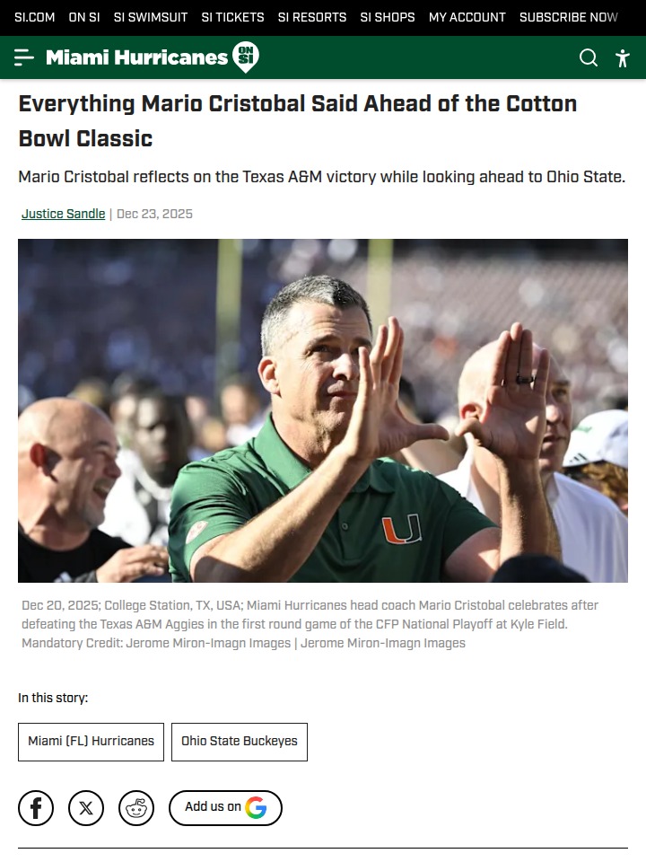 Jay Williams+FollowMiami Hurricanes gear up for Cotton Bowl showdownThe Hurricanes are riding a wave of momentum into the Cotton Bowl Classic, and Coach Cristobal isn’t letting the team get distracted by recent praise or past wins. He’s keeping the focus on grit, resilience, and constant improvement as Miami prepares to face powerhouse Ohio State. Injuries are a concern, but the team’s depth and the emergence of talented freshmen have been huge. Cristobal’s respect for the game shines through—no trash talk, just hard work and belief in his players. How do you feel about Miami’s chances against the defending champs? What’s your take on Cristobal’s approach? #Sports #Football #MiamiHurricanes00Share
