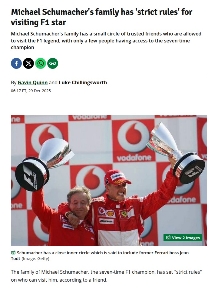 lisa79+FollowSchumi’s Inner Circle: Strict Privacy RulesIt’s been 12 years since The Kaiser’s tragic ski accident, and the Schumacher family is still keeping things ultra-private. Only a handful of F1 insiders—think Jean Todt and Ross Brawn—are allowed to visit the seven-time champ. Even close friends like Richard Hopkins say there’s an unspoken code: no leaks, no updates. Respect to the family for keeping Schumi’s recovery sacred, but it sure keeps the F1 community guessing. #Sports #Racing #MichaelSchumacher00Share