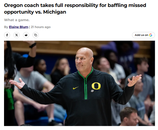 AmberAbyss+FollowOregon’s wild finish vs Michigan sparks debateOregon nearly pulled off a huge upset against #6 Michigan, taking the game to double overtime and even leading late. But a crucial last possession slipped away—no shot taken, and the Ducks lost 92-87. Coach Kelly Graves owned up to the miscue, saying he takes full responsibility for the missed opportunity. Despite foul trouble and missed free throws, Oregon showed they can hang with the best. With a tough schedule ahead, do you think this game proves the Ducks are contenders, or was it just a one-off? Let’s hear your thoughts on what’s next for Oregon! #Sports #OregonDucks #Michigan00Share