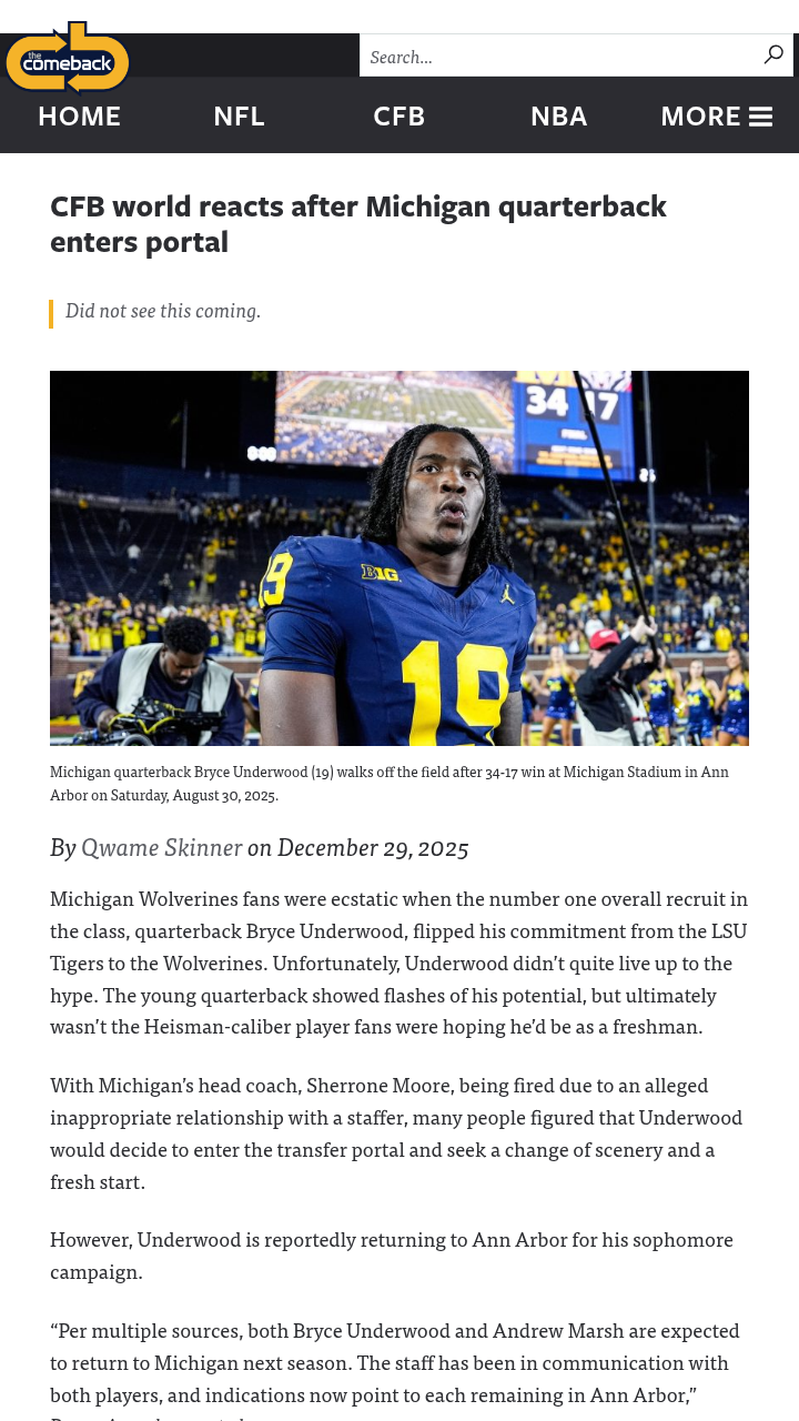 Michael Pitts+FollowBryce Underwood stays with Michigan after Moore firingMichigan football just took a wild turn—head coach Sherrone Moore is out after a university investigation, but the real surprise is that star quarterback Bryce Underwood isn’t jumping ship. Despite rumors he’d transfer, Underwood is sticking around, even showing support for new coach Kyle Whittingham on social media. With both Underwood and Andrew Marsh expected to stay, it looks like Michigan’s future is still bright. What do you think—will Whittingham’s leadership take the Wolverines to the next level, or is this just the start of more drama? #Sports #Football #MichiganFootball00Share