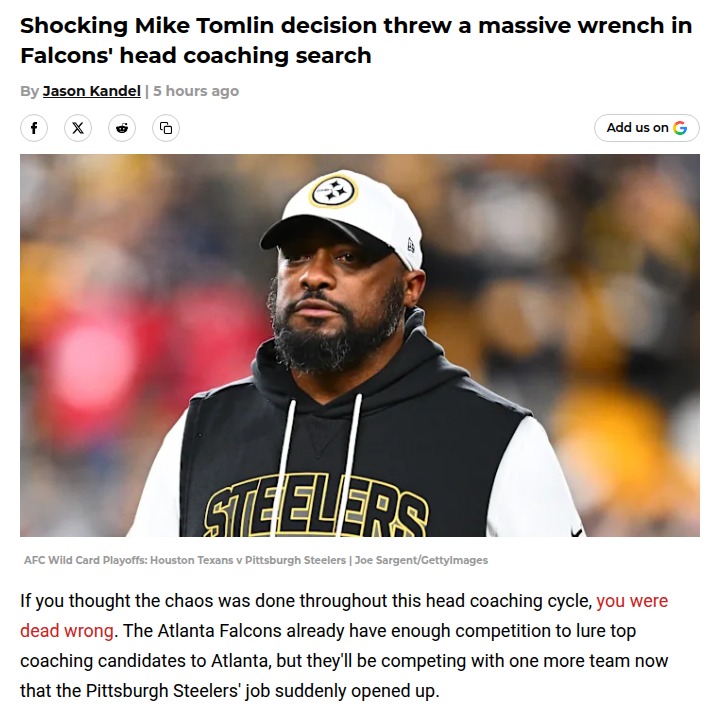 Michael Pitts+FollowMike Tomlin Exit Shakes Up Falcons' SearchWow, Steelers Nation and Dirty Birds fans, what a twist! Mike Tomlin, the NFL’s iron man of coaching, just stepped down instead of getting the axe after another tough playoff loss. Now, the Falcons’ head coach hunt just got a lot more complicated, with Pittsburgh suddenly in the mix for top candidates. Who else thinks the Steelers’ legendary stability could lure away Atlanta’s wish-list names? This rivalry for coaches might be as fierce as anything on the field! #Sports #Football #MikeTomlin10Share