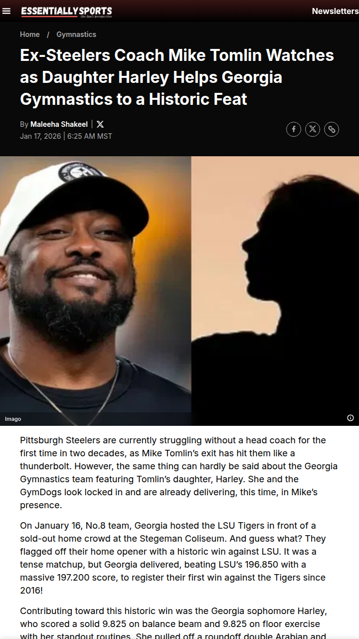 Jenna Gonzales+FollowMike Tomlin on Dad Duty: GymDogs Stun LSU!Steelers Nation, how wild is this? With Coach T stepping away from the Black and Gold, he’s already making headlines—this time as a proud dad! Mike Tomlin was spotted cheering as his daughter Harley and the Georgia GymDogs snapped a decade-long losing streak against LSU. Harley nailed her routines, and the team’s 197.200 was their first win over the Tigers since 2016. Tomlin’s smile said it all—family wins are just as sweet as football victories! #Sports #MikeTomlin #Steelers10Share