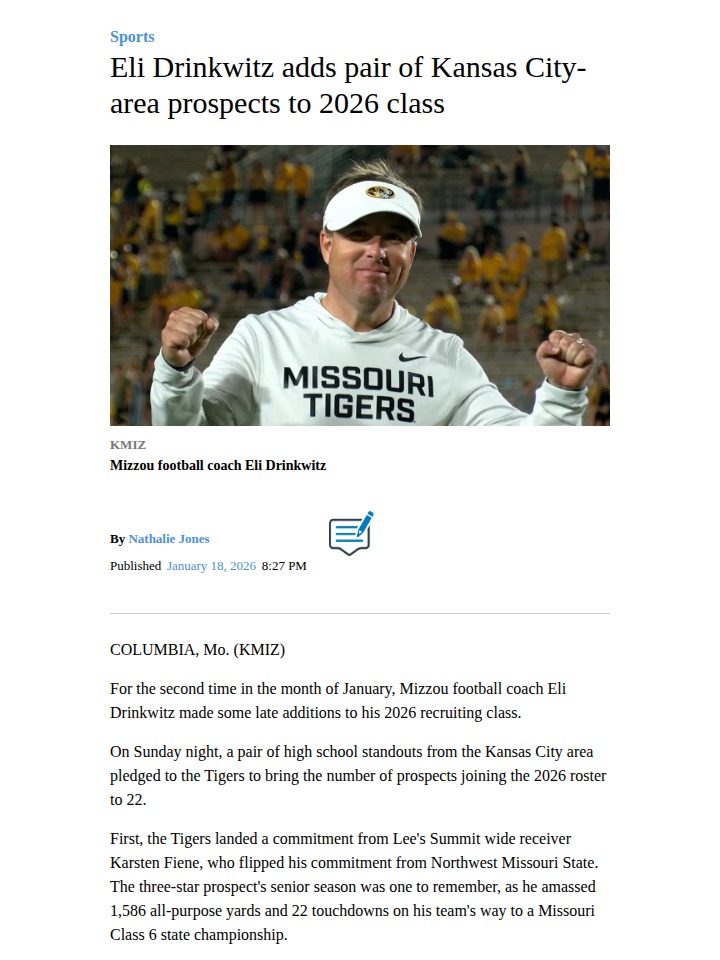 Michael Pitts+FollowKansas City stars boost Mizzou’s 2026 classMizzou football just scored big with two Kansas City-area standouts joining the 2026 roster—wide receiver Karsten Fiene from Lee’s Summit and cornerback Trashundon Neal from Liberty North. Fiene, fresh off a state championship season with 1,586 all-purpose yards and 22 touchdowns, flipped his commitment to the Tigers. Neal, a versatile playmaker on both sides of the ball, chose Mizzou over several major programs. With these additions, the Tigers’ recruiting class is looking stronger than ever. What do you think—will these local talents make an immediate impact for Mizzou? #Sports #Football #Mizzou00Share
