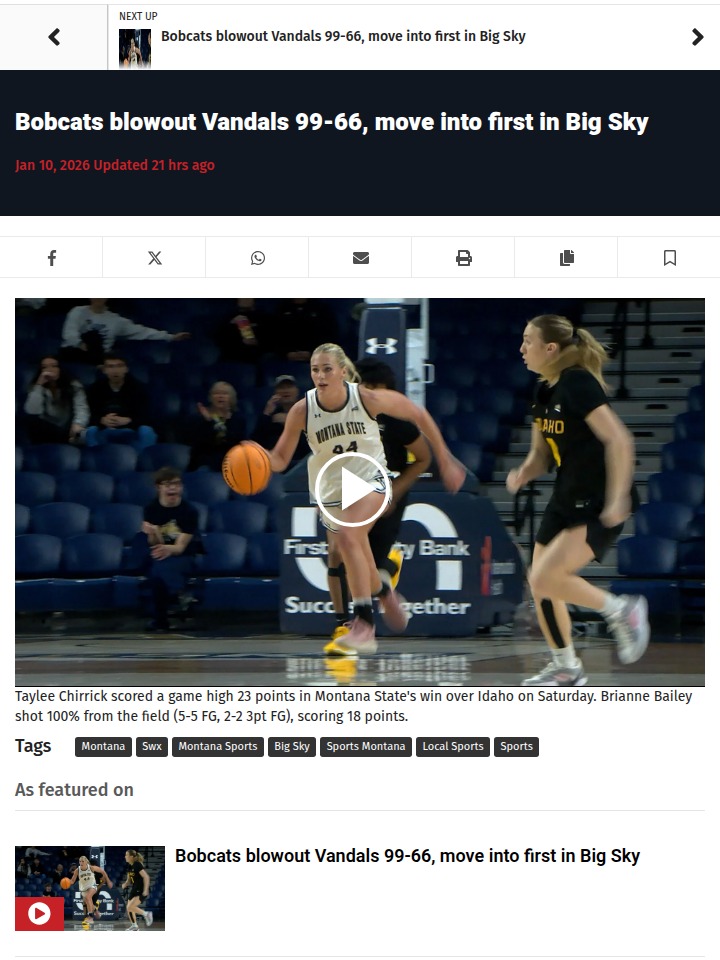 Patrick Gonzales+FollowBobcats dominate Vandals, take Big Sky leadMontana State just put on a show, crushing Idaho 99-66 and jumping to the top of the Big Sky standings. Taylee Chirrick was unstoppable with 23 points, and Brianne Bailey didn’t miss a single shot all game—seriously, 100% from the field! This kind of performance has the whole community buzzing about how far the Bobcats can go this season. With this momentum, could they be the team to beat in the conference? Let’s hear your thoughts on what’s driving their success and what you expect next! #Sports #Basketball #MontanaState00Share