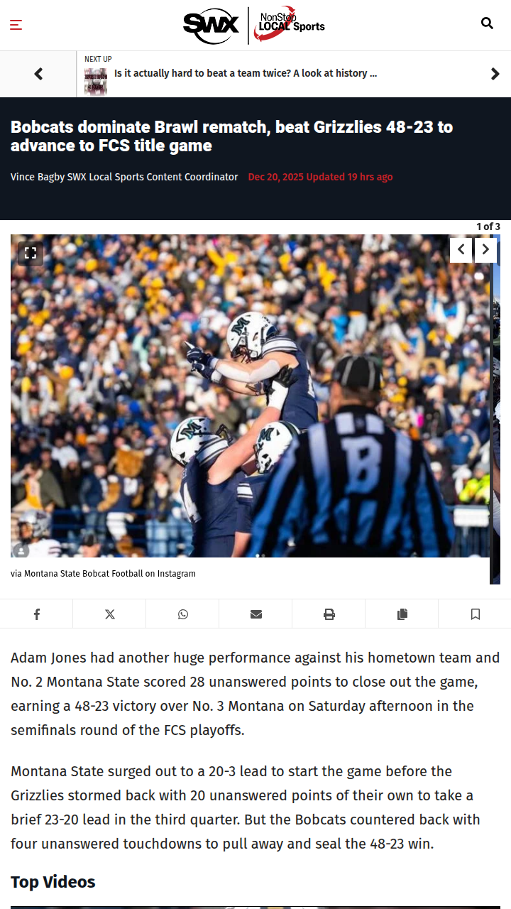 Christopher Hughes+FollowBobcats surge past Grizzlies for FCS title shotMontana State just rewrote the script on their rivalry with Montana, exploding for 28 straight points to clinch a 48-23 win and a spot in the FCS National Championship. Adam Jones, a Missoula native, torched his hometown team again with 131 rushing yards and two touchdowns. The Grizzlies briefly took the lead in the third, but the Bobcats’ offense, led by Justin Lamson’s five total TDs, was unstoppable down the stretch. For fans on both sides, this playoff rematch wasn’t just historic—it was a statement. How do you see this rivalry shaping the future of Montana football? #Sports #Football #MontanaState00Share