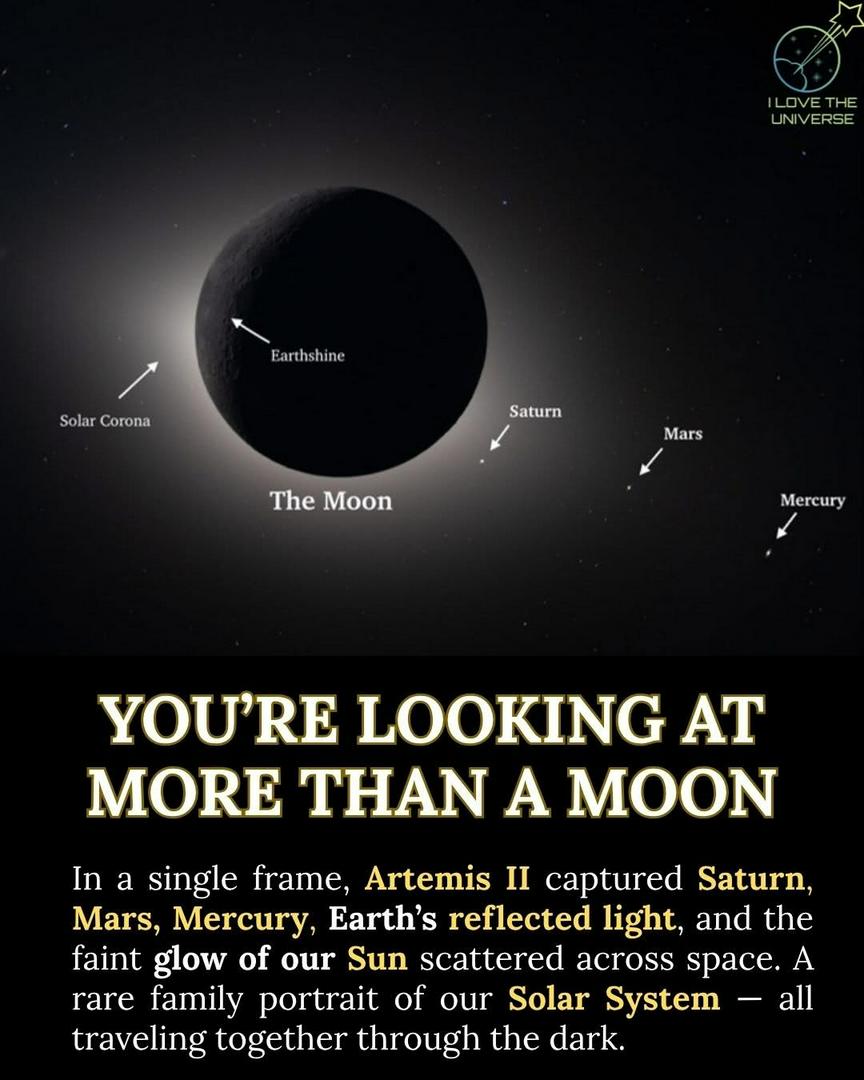 This image captures more than just the Moon… 🤯 Captured by the Artemis II crew, this view reveals not just the Moon, but a quiet alignment of worlds — Saturn, Mars, and Mercury, all shining across the same sky. Even Earth is here, its light softly illuminating the dark side of the Moon. What looks like empty space is anything but — sunlight scattered through interplanetary dust creates a faint glow, reminding us that we are all part of one vast, connected system. Venus sits just beyond the edge of this frame, while Neptune is here too — hidden in the darkness, too faint to be seen. A rare and humbling family portrait of our Solar System — seen not from afar, but from within. 🚀 Credits: NASA/ Artemis II #ArtemisII #NASA #Space #Astronomy #SolarSystem #Moon #Earth #Explore #Cosmos