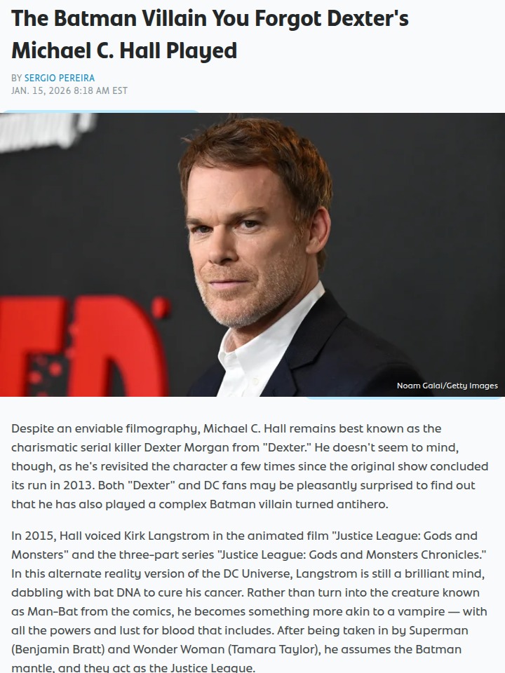 Brittany Rios+FollowMichael C. Hall as Batman?! 🦇Michael C. Hall, forever Dexter to most of us, actually voiced Batman in the animated 'Justice League: Gods and Monsters.' But here’s the twist: his Batman is Kirk Langstrom, a vampire-like antihero, not Bruce Wayne! Some fans think Hall’s dark Dexter vibes made him perfect for this alt-universe Batman, while others say he’ll always be the 'Gotham City Butcher.' Would you want to see him as a live-action Batman, or is he too Dexter-coded? #Entertainment #Movies #MichaelCHall00Share