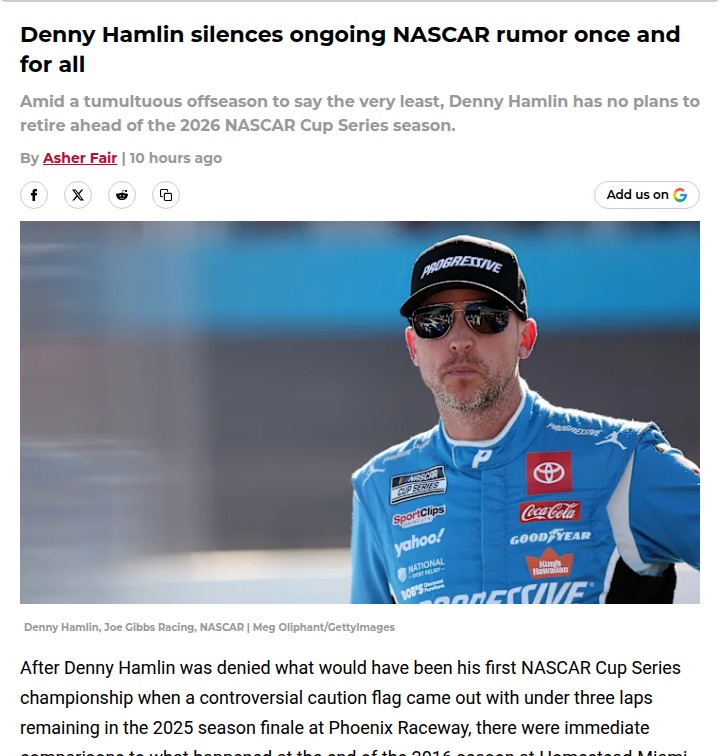 Jason Smith+FollowHamlin: From NASCAR Villain to Fan Favorite?After a gut-wrenching loss at Phoenix due to a late caution, Denny Hamlin—aka the No. 11 wheelman—has put to rest all retirement rumors. Unlike Carl Edwards in 2016, Hamlin says he’s coming back stronger, even after personal tragedy and a settled lawsuit. With the NASCAR community now rallying behind him, could 2026 finally be the year Hamlin gets his elusive Cup? Let’s talk: can the ‘villain’ become the hero? #Sports #Racing #NASCAR41Share