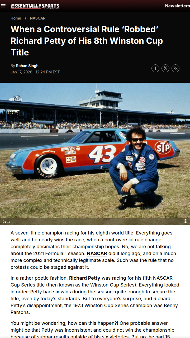 romankimberly+FollowDid NASCAR’s Old Rules Rob The King?Hardcore NASCAR fans, let’s talk about one of the wildest what-ifs in racing history. Back in ’73, The King—Richard Petty—looked set for his 8th Cup, but a bizarre points system based on miles completed flipped the script. Benny Parsons took the crown, even after a wreck, while Petty’s DNFs cost him big. Imagine winning 6 races and still losing the title! Was the old system fair, or did it cheat legends like Petty? #Sports #Racing #NASCAR40Share