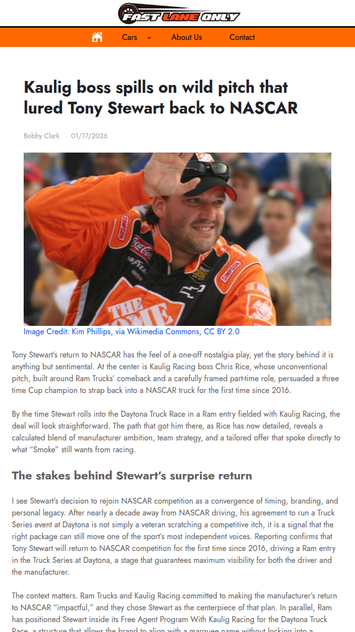 lisa79+FollowSmoke’s Daytona Return: Kaulig’s Power MoveCan you believe it? “Smoke” Tony Stewart is back in NASCAR, but not just for a nostalgia lap. Kaulig Racing boss Chris Rice cooked up a wild pitch—mixing Ram Trucks’ big comeback with a part-time, fun-first offer—that convinced the three-time champ to wheel a Ram at Daytona. This isn’t just a legend scratching an itch; it’s a strategic play that puts Kaulig and Ram on the map and shakes up the Truck Series opener. Thoughts on Stewart as the face of Ram’s return? #Sports #Racing #NASCAR40Share