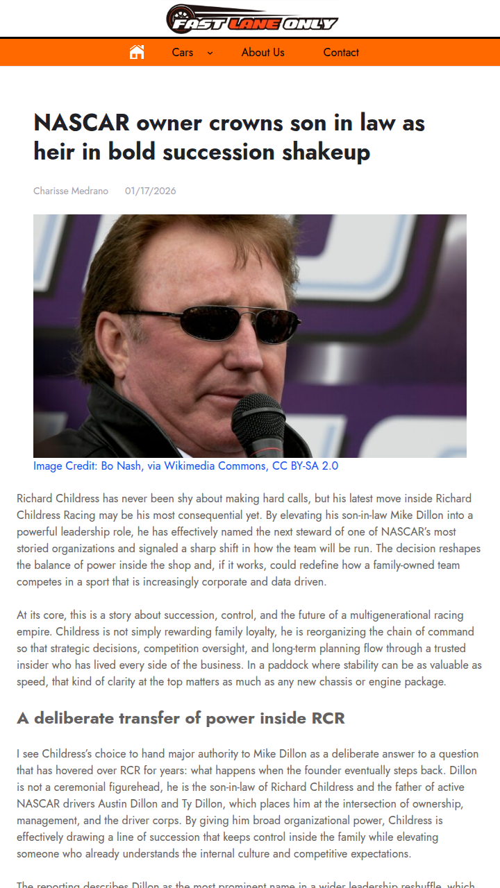 Jason Smith+FollowRCR’s Power Play: Dillon Takes the WheelBig news out of the RCR camp—Richard Childress just handed the keys to the kingdom to his son-in-law, Mike Dillon. This isn’t just a family favor; it’s a calculated move to keep the legendary racing operation in the family while modernizing its leadership. Dillon’s deep ties to both the business and the drivers (he’s Austin and Ty’s dad) could be the secret sauce RCR needs to stay competitive as NASCAR gets more corporate. Will this bold succession shakeup pay off? #Sports #Racing #NASCAR00Share