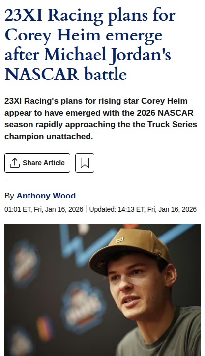 Jason Smith+Follow23XI's Big Bet: Corey Heim's NASCAR Future23XI Racing, co-owned by Michael Jordan and Denny Hamlin, is making headlines after their legal showdown with NASCAR over charter rights. With their three charters now permanent, the focus shifts to rising star Corey Heim. Fresh off a record-breaking Truck Series run, Heim is set for over 10 Cup Series starts in 2026, splitting time between Cup and Trucks. While not full-time, this could be his springboard to a future Cup seat. What do you think—will Heim become 23XI’s next breakout star? #Sports #Racing #NASCAR00Share