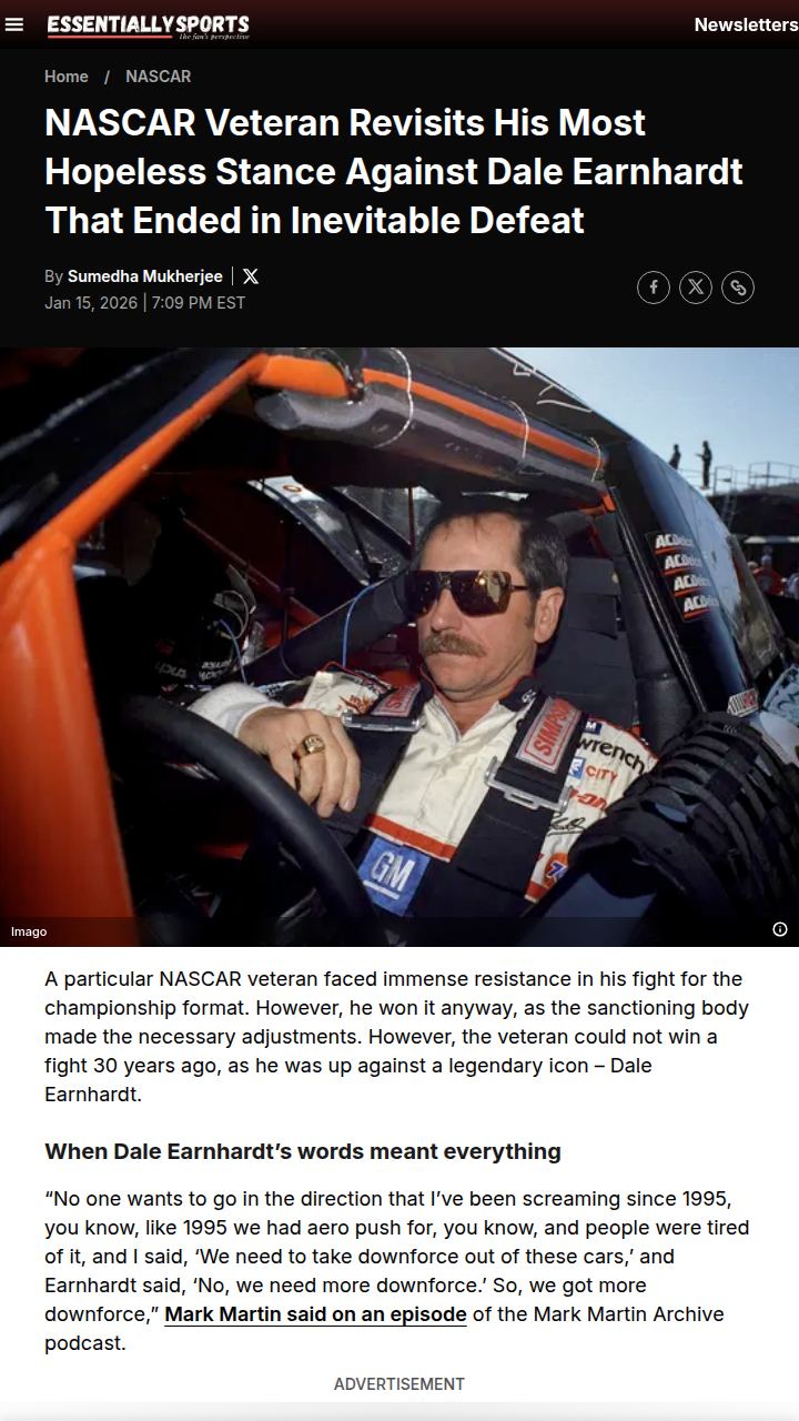 Victor Mathews+FollowMark Martin vs The Intimidator: Aero WarsRemember those classic clashes between Mark Martin and The Intimidator, Dale Earnhardt? Martin just opened up about their off-track rivalry over car aerodynamics. Back in the '90s, he pushed for less downforce, but Earnhardt’s word was law—and the sport went the other way. Fast forward to today, and Martin’s still fighting the aero battle, especially with the Next-Gen cars. Do you think NASCAR will ever solve the dirty air problem, or is it just part of the game? #Sports #Racing #NASCAR20Share
