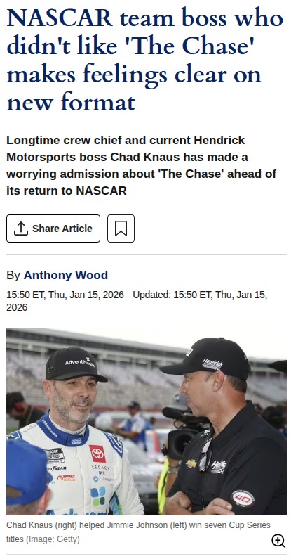 Jason Smith+FollowChad Knaus on NASCAR's 'Chase' ComebackBig news for NASCAR fans: the legendary Chad Knaus, who helped Seven-Time Jimmie Johnson dominate the old 'Chase' era, is giving a cautious thumbs-up to its return. Knaus admits he wasn’t always a fan, but thinks the new 10-race, 16-driver format is a win for fans and teams. With more points for wins and stage points still in play, will this shake up the Hendrick vs. Johnson rivalry at Daytona? #Sports #Racing #NASCAR10Share