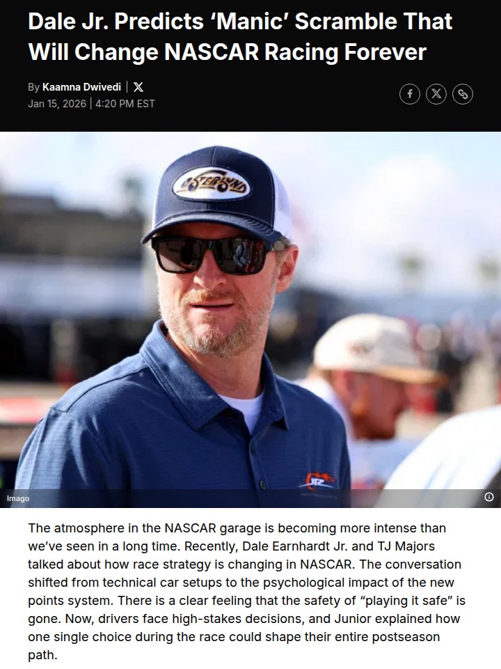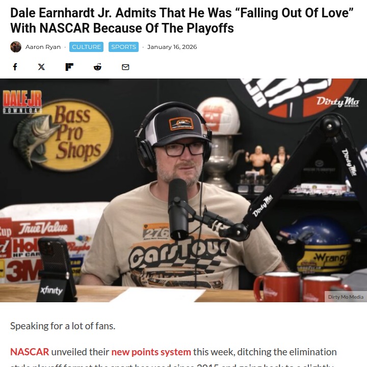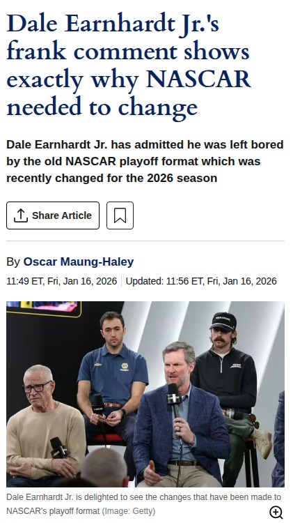 jennifer23+FollowDale Jr. Backs NASCAR's Playoff ShakeupDale Jr. just dropped some real talk on why NASCAR needed to ditch the old 'win-and-you're-in' playoff system. The Intimidator’s son admitted he was tuning out because every race didn’t matter anymore. With The Chase format coming back in 2026, every lap counts again—no more coasting to Phoenix. Fans, are you ready for the drama to return? #Sports #Racing #NASCAR20Share