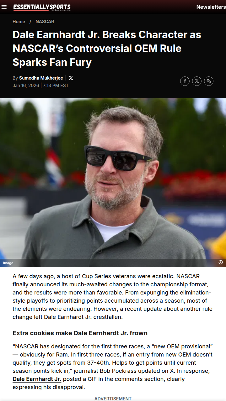 Jason Smith+FollowDale Jr. Slams NASCAR’s Ram RuleWow, did you all catch Dale Jr. breaking his usual cool over NASCAR’s new OEM provisional rule? The Intimidator’s kid isn’t having it—he thinks Ram getting a free pass for the first three races is unfair to teams who had to earn their stripes. Fans are split: some say it’s a smart move to bring in new manufacturers, others call it a slap in the face to tradition. What do you think—should new OEMs get a leg up, or is this just bad for the sport? #Sports #Racing #NASCAR85Share