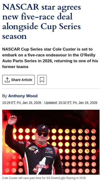 Roger Franco+FollowCole Custer Returns: SS GreenLight Reunion!Big news for NASCAR fans—Cole Custer, the 2023 O’Reilly Series champ, is reuniting with SS GreenLight Racing for five races in 2026! The No. 41 Haas Factory Team driver is looking to add to his legacy and maybe even bring the team another win, like his memorable Fontana victory. With Custer back, can SS GreenLight break their single-win streak? Let’s hear your predictions! #Sports #Racing #NASCAR00Share