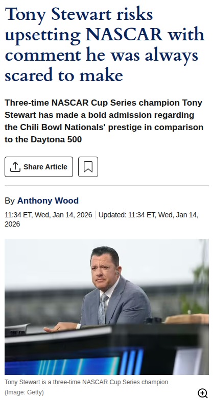 jennifer23+FollowTony Stewart says Chili Bowl tops DaytonaTony Stewart just shook up the racing world by saying the Chili Bowl Nationals means more to him than the Daytona 500. For Stewart and many die-hard motorsports fans, beating 400 drivers at Tulsa’s legendary event is tougher—and more rewarding—than outpacing the usual 40 at Daytona. With NASCAR stars like Kyle Larson and Christopher Bell joining the massive field, the Chili Bowl’s reputation as the ultimate test keeps growing. Do you agree with Stewart that the Chili Bowl is racing’s real crown jewel, or does Daytona still hold the top spot for you? #Sports #Racing #NASCAR30Share