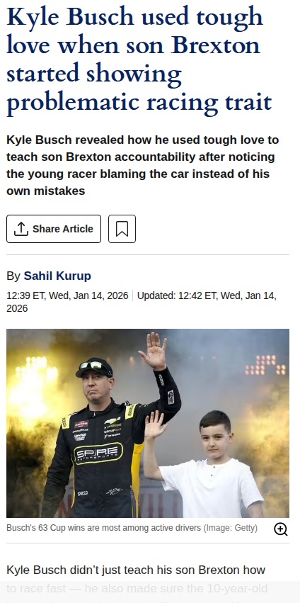 Jason Smith+FollowKyle Busch’s tough love lesson for BrextonKyle Busch isn’t just raising a racer—he’s raising a competitor who owns his mistakes. When Brexton, his 10-year-old son, started blaming his car for bad results, Busch stepped in with some real talk: no excuses, just accountability. Busch, a two-time NASCAR champ, knows that growth on the track comes from self-reflection, not finger-pointing. Now, Brexton’s not only winning races but learning the mindset it takes to succeed long-term. It’s a reminder that in racing—and in life—taking ownership is everything. How do you handle setbacks: do you look for excuses, or do you look inward? #Sports #Racing #NASCAR30Share