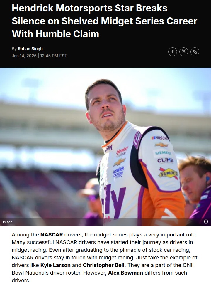 Kyle Bennett+FollowBowman’s Midget Racing Dilemma: Too Tall to Tangle?Interesting insight from “Bowman the Showman” at the Chili Bowl! Unlike dirt legends like Yung Money (Larson) and Bell, Alex Bowman says he’s just too tall for midget cars—literally. His knees jam up in the cockpit, making it unsafe and uncomfortable. Given his injury history and HMS’s high expectations, can you blame him for playing it safe? With his Cup seat on the line for 2026, is this the right call for his career? #Sports #Racing #NASCAR00Share