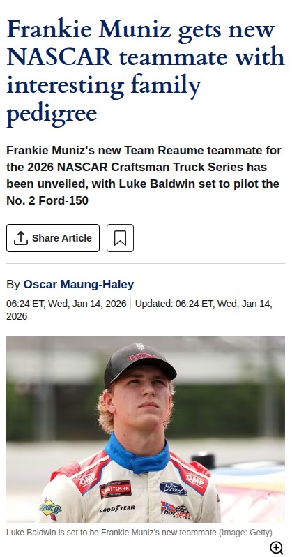 qglover+FollowFrankie Muniz & Baldwin: NASCAR's New DuoTeam Reaume just shook up the NASCAR Craftsman Truck Series by pairing Hollywood’s own Frankie Muniz with rising star Luke Baldwin, son of racing legend Tommy Baldwin Jr. Fans are buzzing about this new partnership—can Muniz’s showbiz grit and Baldwin’s family pedigree spark a fresh rivalry in the Truck Series? With Baldwin set to debut at Rockingham, all eyes are on how this dynamic duo will stack up against the competition. #Sports #Racing #NASCAR20Share