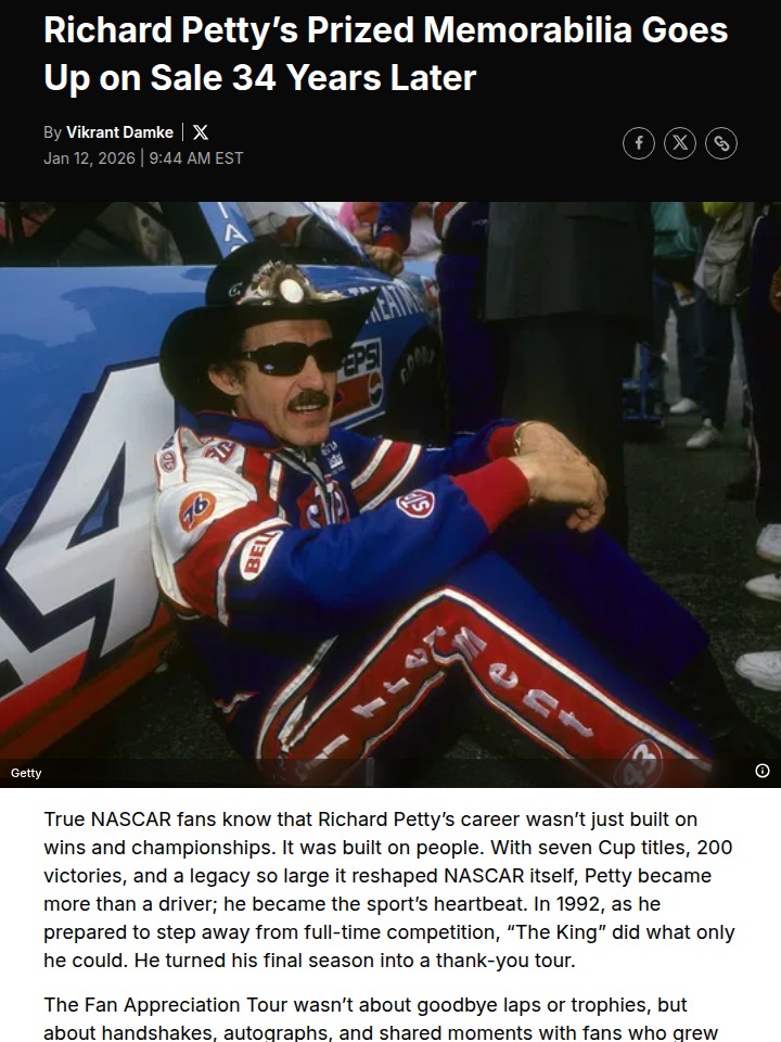 jennifer23+FollowThe King’s 1992 Farewell Suit Up for Grabs!NASCAR faithful, this is one for the ages! Richard “The King” Petty’s 1992 Fan Appreciation Tour suit from Atlanta is hitting the collector’s market after 34 years. This isn’t just a firesuit—it’s a piece of NASCAR’s soul, stitched with memories from Petty’s emotional goodbye lap. Remember that wild Hooters 500 finale? Now you can own a slice of that legacy. Would you pay top dollar for a suit that says ‘thank you’ to the fans? #Sports #Racing #NASCAR10Share