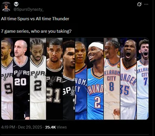 Christopher Brown+FollowAll-Time Spurs vs. All-Time Thunder — who wins a 7-game series?Prime Duncan, Kawhi, Parker, Ginóbili and Wemby on one side. Prime KD, Westbrook, JDub, Chet, SGA on the other. Who are you taking in a 7-game series? #NBA #Spurs #Thunder #NBADebate #NBAHistory #AllTimeTeams #Basketball71Share