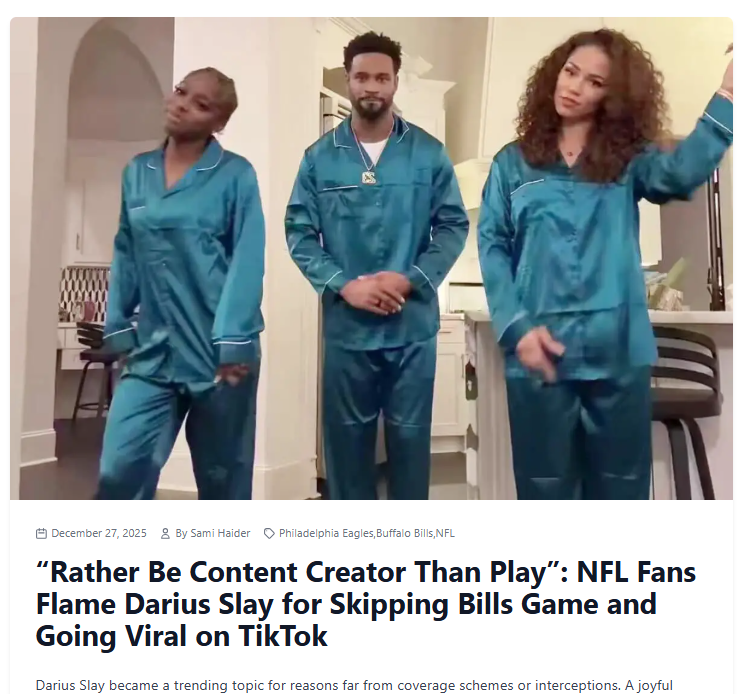 Charles Brown+FollowSlay Skips Bills for TikTok Fame? 🤔NFL Twitter is on fire after Darius Slay’s Christmas TikTok went viral—right when the Bills needed him most. Fans are split: some say he’s prioritizing family and mental health, others claim he’s chasing clout over a playoff run. The real drama? Whether Slay’s next move is back to the field or full-time content creator. Is this the new NFL reality? #Entertainment #DariusSlay #NFLDrama10Share