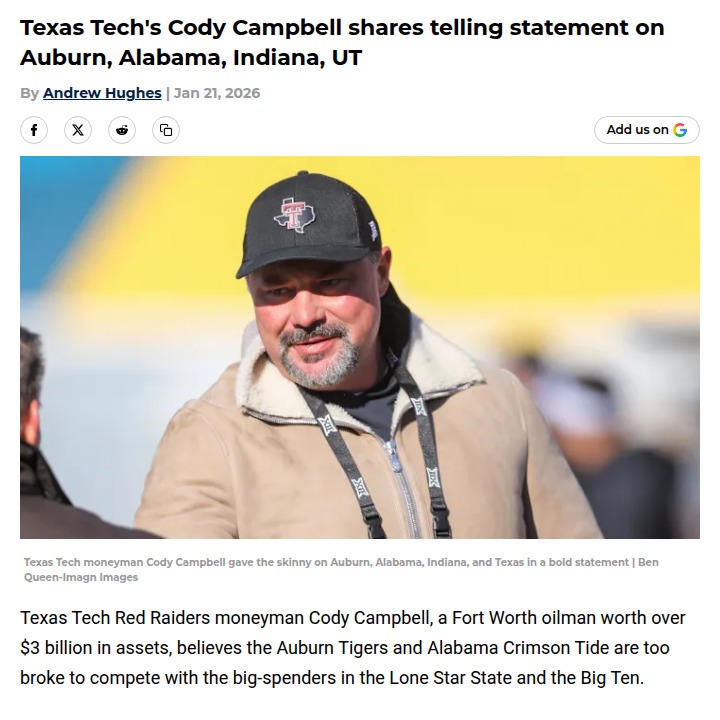 Aaron Taylor+FollowTexas Oil Money vs. SEC PowerhousesCody Campbell, the Red Raiders’ deep-pocketed booster, just threw some serious shade at Auburn and Bama, saying neither has the cash to keep up with the Texas Longhorns in the new NIL era. He even called out Auburn for lacking respect, but gave a nod to the Tide’s tradition. Campbell predicts Indiana could rise, but says the real blue bloods now are whoever’s got the biggest checkbook. Thoughts on this new money game? #Sports #Football #NIL00Share