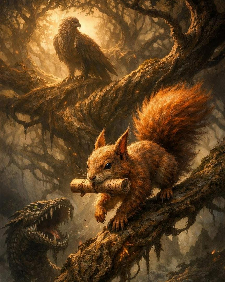 Ratatoskr is the squirrel who lives on Yggdrasil, the world tree in Norse mythology. He runs up and down the trunk of the tree, carrying messages between the great eagle perched at the top and Nidhogg, the serpent gnawing at the roots below. The texts don’t say the messages are true or false, only that they fuel hostility between the two. Ratatoskr isn’t a god, a warrior, or a monster. He represents communication itself: how words travel between worlds, how conflict is carried, and how small messengers can influence vast forces. In Norse thought, even minor beings had a role in maintaining or unsettling the cosmic balance. Not everything that shapes the world does so with strength. Some things do it with words. You don’t have to be at the top of the tree to matter. You don’t have to dwell in the depths to have power. Most of us live in the middle moving between worlds, people, ideas, and moments. And that is not a weakness. It is a responsibility. Your voice carries farther than you think. The way you speak, listen, and choose your words shapes the spaces you move through. You belong because you connect. You matter because you carry meaning. Even the smallest messenger can influence the fate of worlds when they move with awareness and intention. Walk your path. Carry wisely. You are needed. #NordicDaughter #Ratatoskr #Yggdrasil #NorseMythology #PoeticEdda #WorldTree #AncientStories #ModernSaga