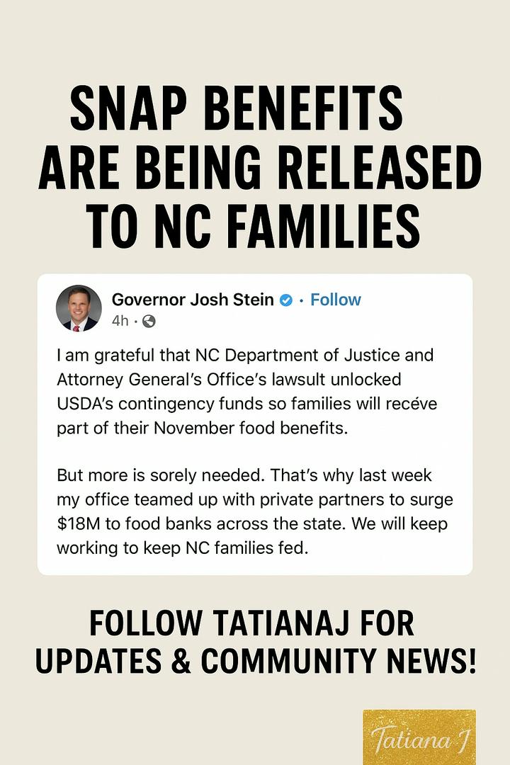 💥 Governor Josh Stein Announces Funding Boost to Help Feed North Carolina Families Amid SNAP Pause‼️ Governor Josh Stein just announced that a new lawsuit has helped unlock USDA funds, allowing North Carolina families to receive part of their November food benefits. While food stamp (SNAP) assistance has been partially paused, the state is teaming up with private partners to send $18 million to food banks across NC. This is a major relief for thousands who rely on these programs to keep food on the table. 🥫🍎 👉 Follow TatianaJ to stay updated on community resources, local news, and important updates that impact North Carolina families! #NorthCarolina #JoshStein #SNAPBenefits #FoodStamps #USDA #FoodBank #TatianaJ #NewsBreak #CommunityUpdates #SNAPBenefits #SNAPLife #SNAPTalk