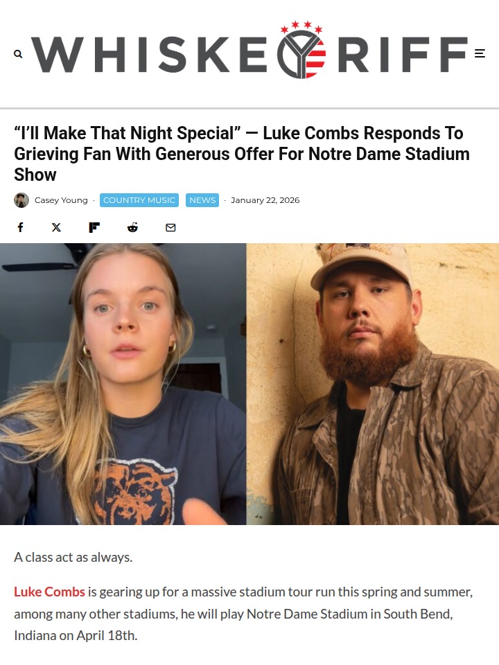davidsonbrandon+FollowLuke Combs to Lift Spirits at Notre DameCountry superstar Luke Combs just proved why fans call him a class act. After a heartbreaking TikTok from Maddie about her brother Conner losing their dad at Notre Dame, Combs promised to make his April 18th show at the stadium extra special for the family. Looks like Conner, a huge Combs fan and ND freshman, will get a memorable night and a much-needed positive memory at the stadium. True country heart from the big man! #Sports #LukeCombs #NotreDame00Share