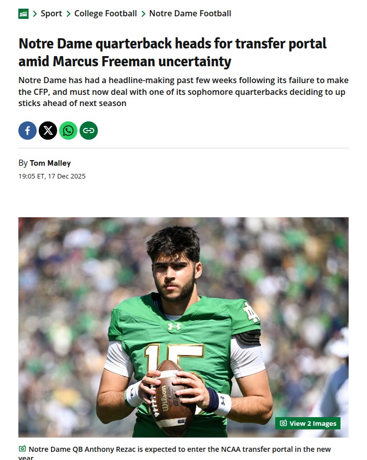 glen25+FollowNotre Dame’s QB shakeup: What’s next?Notre Dame football is facing a real crossroads. With Anthony Rezac entering the transfer portal and head coach Marcus Freeman’s future up in the air, the team is suddenly down to just two quarterbacks for the 2026 season. Add in star players declaring for the NFL Draft and others transferring, and it feels like the program is in flux. Fans are left wondering: Is this just a rough patch, or are we seeing the start of a bigger rebuild? How do you feel about the changes, and what do you think Notre Dame should do next? #Sports #Football #NotreDame00Share