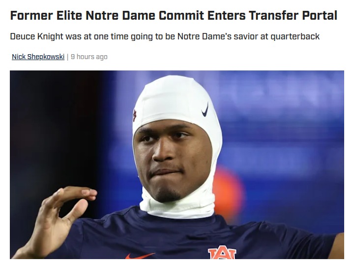 Amy Williams+FollowDeuce Knight’s Portal Move: Irish QB What-IfsWow, Deuce Knight is back in the headlines! The former five-star QB who once had Irish fans dreaming big just hit the transfer portal after a short stint with Auburn. Remember when his flip from Notre Dame to the Tigers felt like a gut punch? Now, with CJ Carr thriving and the Irish QB room looking stacked, it’s wild to think how fast things change. No need for a reunion—Notre Dame’s future is already bright! #Sports #Football #NotreDame10Share