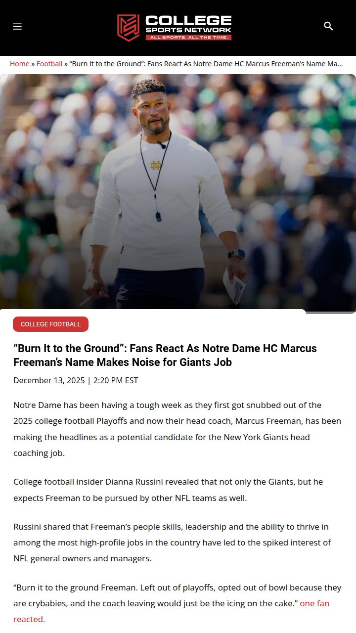 Jeffrey Armstrong+FollowFreeman to Giants? Irish Fans Sound OffWow, what a week for the Fighting Irish! First, Notre Dame gets left out of the CFP, and now Marcus Freeman’s name is buzzing for the Giants’ head coaching gig. Some fans are fired up, saying Freeman’s people skills are NFL-ready, while others think he’s built for the college game. The playoff snub and possible coaching change have really split the fanbase. What do you think—should Freeman take the leap to the NFL or stick with the Irish? #Sports #Football #NotreDame00Share
