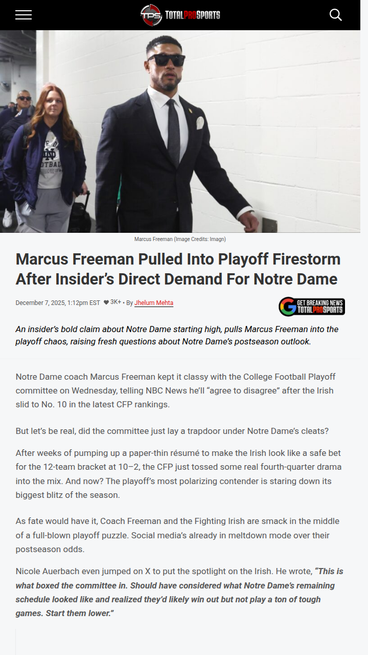 Christopher Hughes+FollowIrish Playoff Hopes Teeter After CFP SnubFighting Irish fans, are we witnessing a classic CFP controversy or what? Marcus Freeman kept his cool, but the committee dropping Notre Dame to No. 10 has social media buzzing. After steamrolling Stanford, the Irish still sit ahead of Miami (who beat them!), sparking the age-old debate: head-to-head wins vs. full résumé. With championship weekend looming, it’s chaos or bust for ND’s playoff dreams. Did the committee box themselves in by overhyping the Irish early? Sound off, Irish Nation! #Sports #Football #NotreDame00Share
