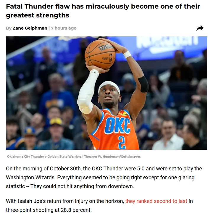guerrajohn+FollowOKC Thunder’s wild run: 23-1 with a twistThe Thunder are tearing up the NBA with a 23-1 start and a mind-blowing +16.2 point differential, but here’s the kicker: their best starting five hasn’t even played a single minute together this season! Despite juggling 10 different lineups and battling injuries, OKC is still dominating both ends of the court and leading the league. Mark Daigneault’s coaching is getting major praise, but it’s the team’s insane depth and resilience that really stand out. How far do you think this Thunder squad can go once they’re finally at full strength? #Sports #Basketball #OKCThunder00Share