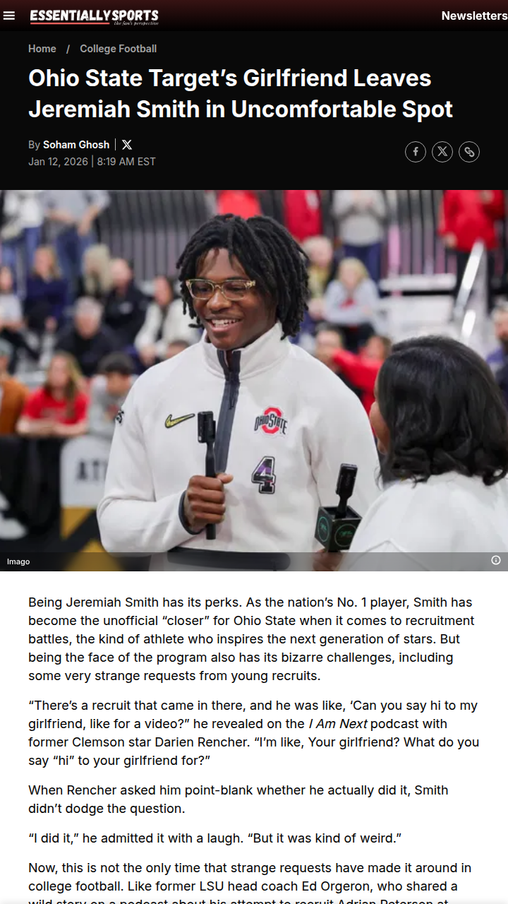 Amy Williams+FollowJeremiah Smith’s wildest recruiting moment yetOhio State’s star receiver Jeremiah Smith just shared a recruiting story that’s as awkward as it is hilarious. During a campus visit, a fellow recruit asked Smith to record a video greeting for his girlfriend—talk about unexpected job duties! Smith, who’s become the Buckeyes’ secret weapon in attracting top talent, didn’t hesitate to help, even if it felt a bit weird. His commitment to building a powerhouse roster is clear, and recruits are noticing. With Smith’s drive and personality, Ohio State’s future looks even brighter. Would you go the extra mile like Smith to land the next big star? #Sports #Football #OhioState00Share