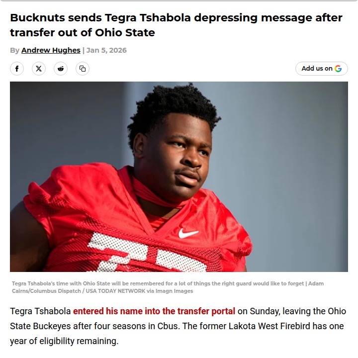 Jay Williams+FollowBuckeyes' Tegra Tshabola Eyes SEC MoveBig news out of Columbus: starting RG Tegra Tshabola, a key piece of the Buckeyes’ O-line, is officially in the transfer portal and lining up visits with Auburn and Kentucky. After helping the Scarlet and Gray chase a natty, Tegra’s next stop could be a big-time SEC rivalry. With the “Portal King” on the move, who do you think steps up at RG for the Buckeyes next season? #Sports #Football #OhioState00Share