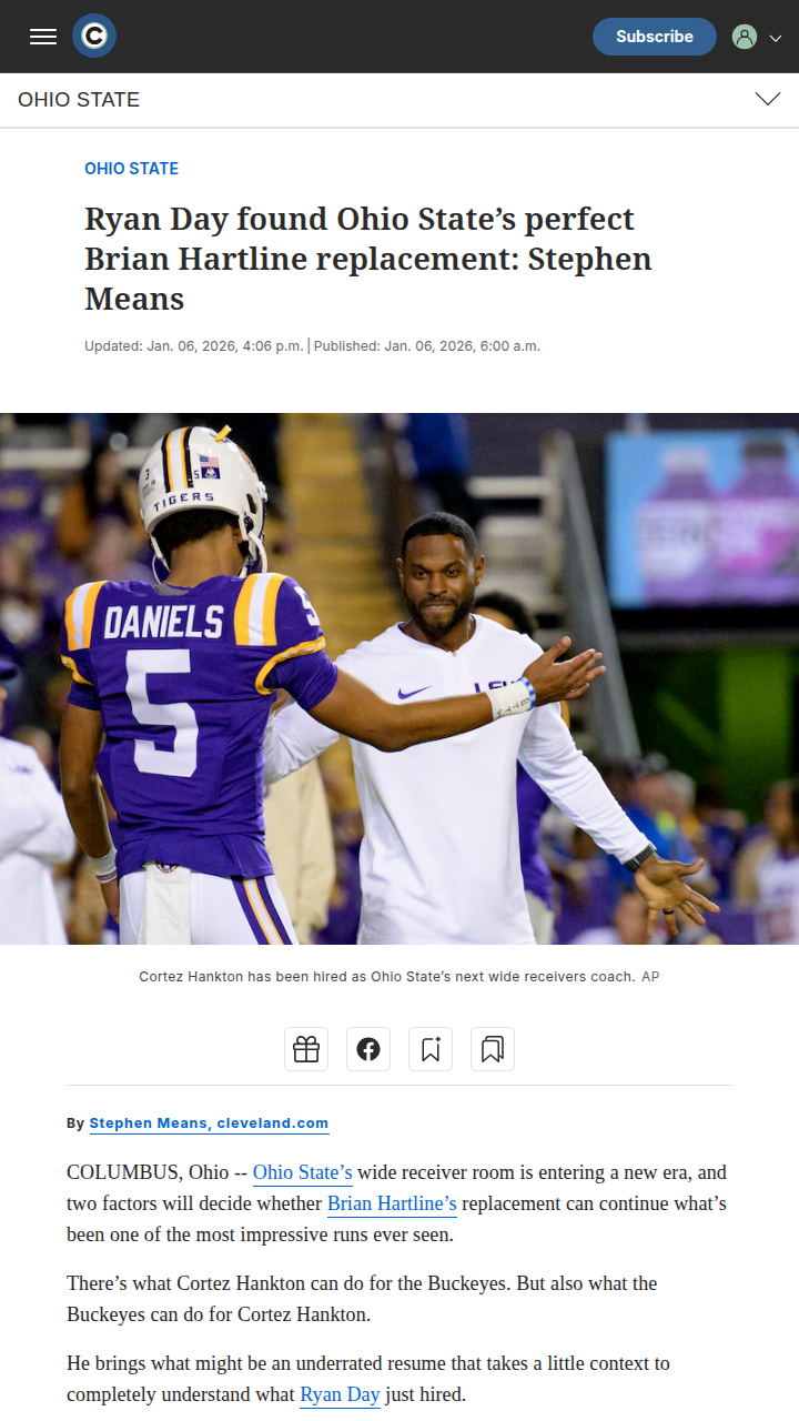 Amy Williams+FollowCortez Hankton steps in for Hartline at Ohio StateOhio State’s wide receiver room is about to get a fresh spark with Cortez Hankton taking over for Brian Hartline. Hankton’s recruiting chops are no joke—he’s landed five-star talent at Georgia and LSU, and he’s known for spotting hidden gems like Ladd McConkey. Now, with Ohio State’s resources behind him, he won’t have to worry about losing recruits over NIL deals. The big question: Can he keep the Buckeyes’ WR pipeline rolling and maybe even take it to new heights? Buckeye Nation, what are your thoughts on this new era? #Sports #Football #OhioState00Share