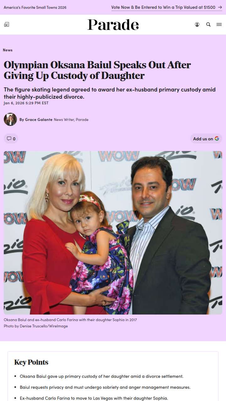 Mrs. Maria Shelton MD+FollowOksana Baiul’s Divorce Drama: Custody ShockerOlympic champ Oksana Baiul just lost custody of her 11-year-old daughter in a messy split with ex Carlo Farina. He’s moving to Vegas with their kid, and Baiul only gets visits if her daughter’s cool with it. She keeps her designer bags and Olympic cash, but has to take anger management and drug tests. Both sides threw wild accusations, but the settlement is final—no child or spousal support either. This is one breakup you have to see to believe! #Relationships #OksanaBaiul #DivorceDrama00Share