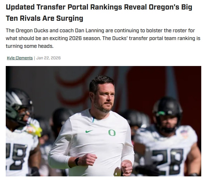 phughes+FollowOregon Ducks face Big Ten transfer portal shakeupOregon Ducks fans, things are heating up in the transfer portal—and not just for us. Four Big Ten rivals are outpacing Oregon in the latest transfer rankings, with Indiana, UCLA, Wisconsin, and Purdue all landing higher spots. While Oregon has brought in 14 new faces, we've lost 30 to the portal, and our current ranking sits at No. 27. Still, with key players like Dante Moore and standout transfers like Koi Perich, the Ducks seem focused on quality over quantity. What do you think: Should Oregon push for more big names, or trust the core we’ve got? #Sports #Football #OregonDucks00Share