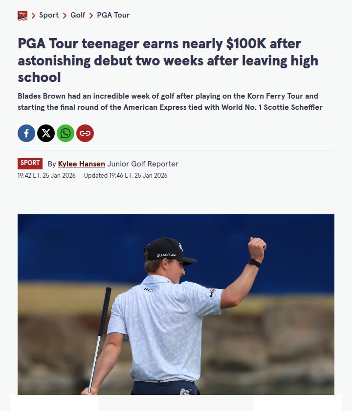 Ryan Wilkinson+FollowBlades Brown Shakes Up American ExpressDid anyone see Blades Brown’s wild run at The American Express? The 18-year-old rookie, fresh out of high school, went toe-to-toe with Scottie “Scheff Daddy” Scheffler and even set a course record 60 on Friday! Brown faded a bit on Sunday but still pocketed nearly $100K and gained major respect. Playing alongside the world No. 1 must’ve been a masterclass. Is this the start of a new rivalry or just a glimpse of what’s to come? #Sports #Golf #PGATour00Share