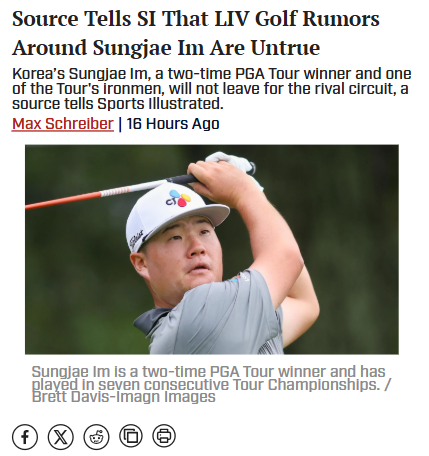 Gabriella Gonzalez+FollowSungjae Im Shuts Down LIV Golf RumorsBig news for PGA Tour fans: Sungjae Im, aka the Ironman of the Tour, just put those LIV Golf rumors to bed. After some buzz about a possible move to the Saudi-backed league, Im took to Instagram and called it “fake news.” With Si Woo Kim likely joining LIV, it’s great to see Im doubling down on his PGA Tour legacy. Thoughts on how this shapes the rivalry between the tours? #Sports #Golf #PGATour10Share