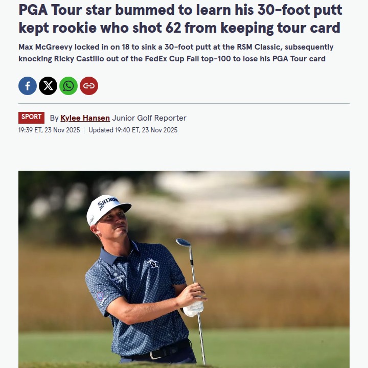 Heather Garcia+FollowHeartbreak at RSM: McGreevy’s Clutch Putt Ends Rookie DreamTalk about drama on the 18th! Max McGreevy drained a wild 30-footer to clinch second at the RSM Classic, but that ice-cold finish meant rookie Ricky Castillo—who fired a jaw-dropping 62—missed out on keeping his Tour card. It’s a brutal reminder of how every shot counts, especially when careers are on the line. Props to Castillo for battling to the end. Do you think McGreevy should feel bad, or is this just the nature of the Tour? #Sports #Golf #PGATour10Share