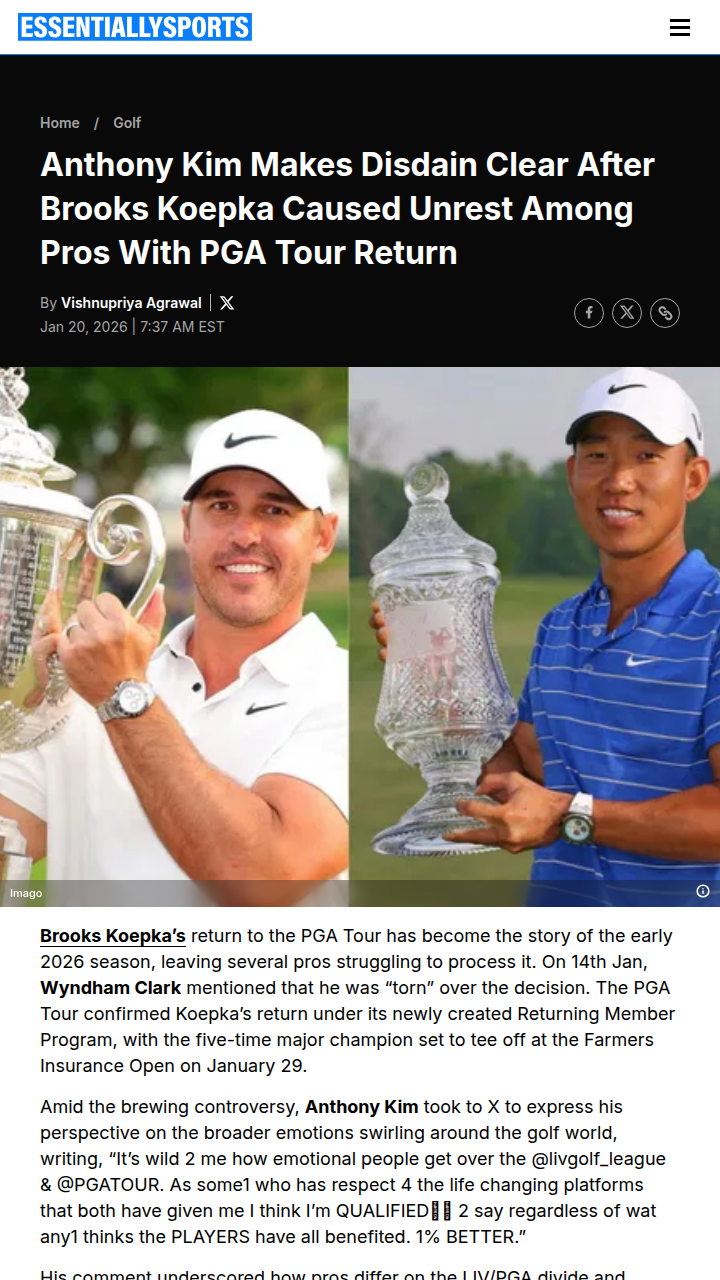 Gabriella Gonzalez+FollowKoepka’s PGA Tour Return Sparks Player DivideBrooks “The Machine” Koepka is back on the PGA Tour, but not everyone’s rolling out the red carpet. The new Returning Member Program lets major winners like Koepka rejoin, but some pros—like Wyndham Clark—feel the penalties are too light. Anthony Kim, now a LIV vet, chimed in on X, saying both tours have helped players and the drama is overblown. Meanwhile, Tiger and Rory say Brooks boosts the field, but others see it as unfair. Where do you stand on this Koepka comeback? #Sports #Golf #PGATour00Share