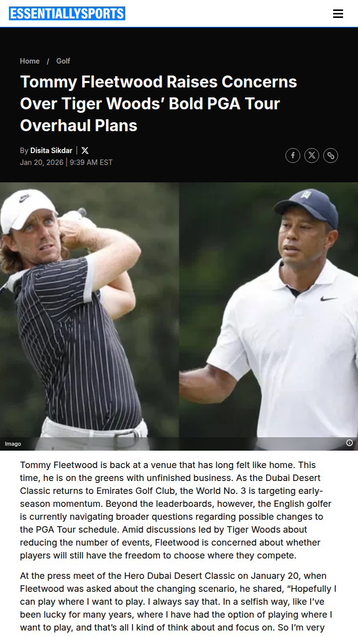 frank59+FollowTiger’s PGA Tour Shakeup: Fleetwood Weighs InTommy Fleetwood, aka “Tommy Lad,” is making headlines off the course at the Dubai Desert Classic. With Tiger Woods pushing for a bold PGA Tour overhaul—possibly slashing the number of events—Fleetwood voiced concern about losing the freedom to pick his schedule. He’s adapted to changes before, but wonders if the new era will limit player choice. Plus, he shot down rumors of a LIV Golf approach. What do you think—should the Tour tighten up, or keep things open for the stars? #Sports #Golf #PGATour00Share